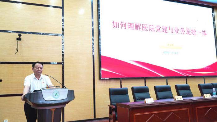 在庄严的国歌声中,大会正式拉开帷幕。党委书记谭东辉代表院领导班子向全体党员致以节日问候,向受表彰的先进集体和个人表示热烈祝贺。随后,围绕“如何理解医院党建与业务是统一体”“科主任如何在困境中发挥承上启下作用”两方面,为与会人员讲授了一堂精彩的党课。他指出,在当前深化改革、创新发展的关键时期,全院基层党组织和党员干部要以党建为引领,将政治建设、思想建设、组织建设、作风建设、纪律建设、制度建设和反腐倡廉贯穿到“医、教、研、管、信”各项业务中,做到目标统一、过程融合、主体一致、成效互促、破除误区;科主任要以高度的责任感和担当精神,发挥承上启下的关键要素,做好医院战略执行者,政策智慧的转化者,团队建设的主导者,思想建设的引领者,困境破局的推动者,为建设特色鲜明的医教研并重现代化医院再立新功。