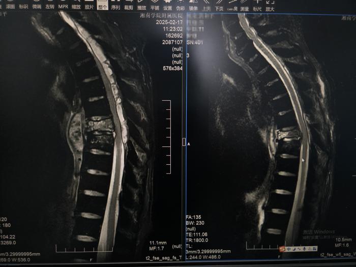 完善相关检查后,果然明确了患者为胸椎感染,椎旁及椎管内有大量脓肿,特别是椎管内的脓肿,从胸7椎体延伸到了颈7椎体,脊髓受到严重压迫,导致患者双下肢不完全瘫痪,已经不能站立,更别说行走,需尽快手术治疗。