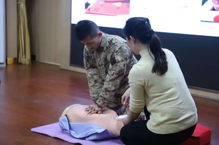 2025年3月5日,湘南学院附属医院急诊科主任袁斌云与护士长白素娟来到郴州某部队,为官兵开展了一场“第一目击者”现场急救技能培训。此次培训以“心肺复苏(CPR)与AED使用”为核心内容,通过通俗易懂的讲解和沉浸式的实操,帮助参训人员掌握“黄金4分钟”内有效施救的技能。